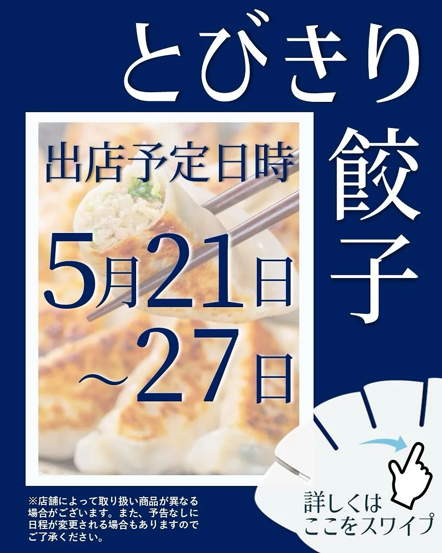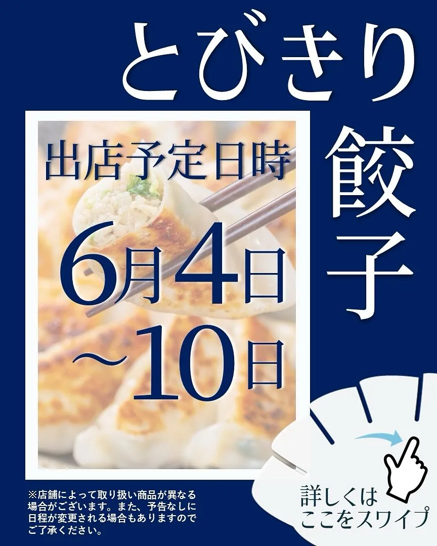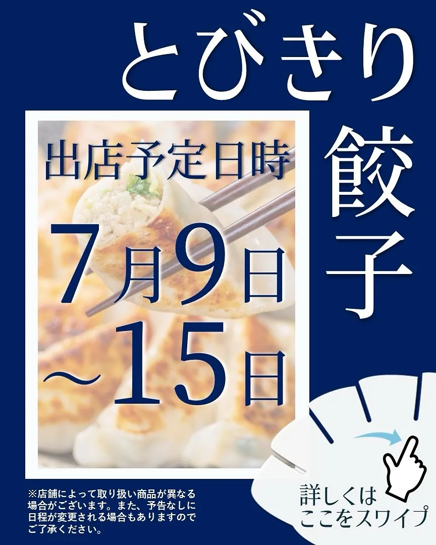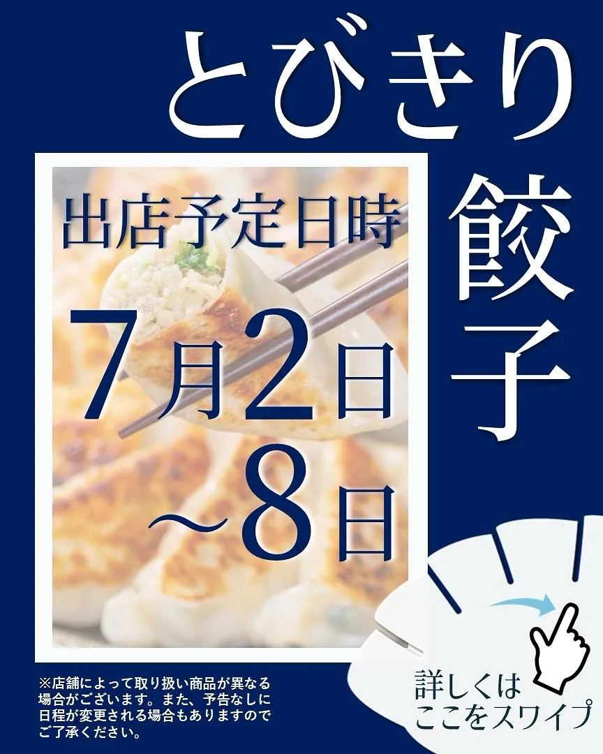 【出店情報】 【出店情報】「とびきり餃子」では、最高の品質と味を追求した自慢の餃子をお届けしています✨お客様にご満足いただけるよう、心を込めたサービスを心がけており、これからも多くの方々にその絶品の餃子を…